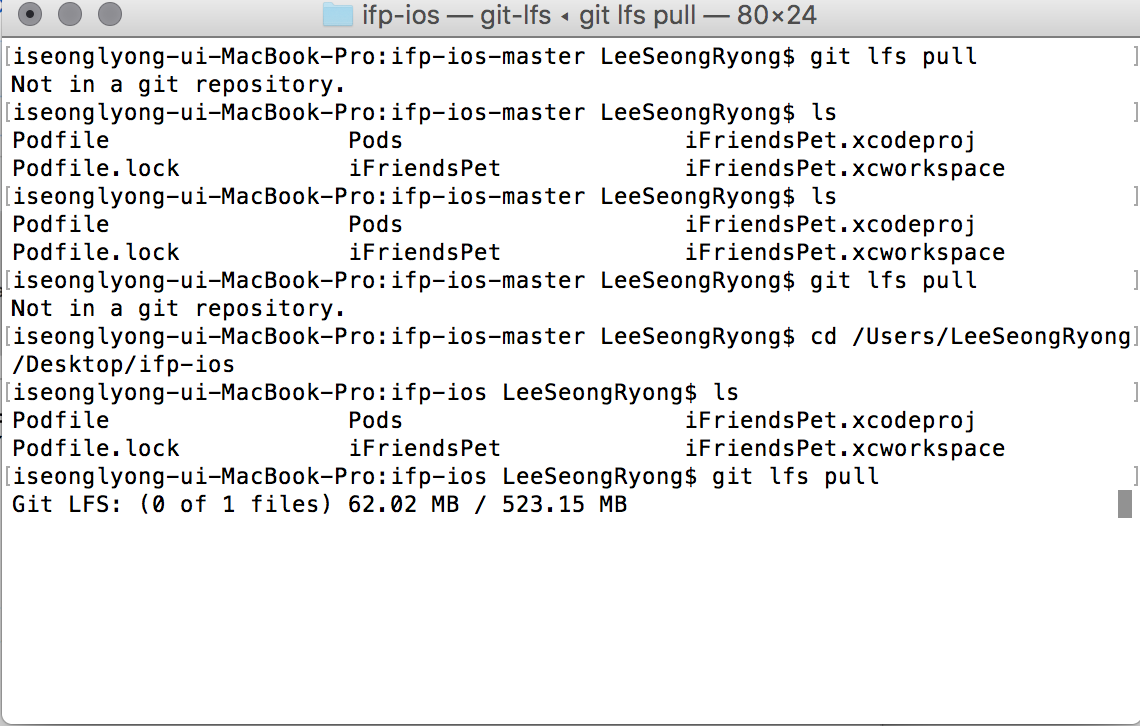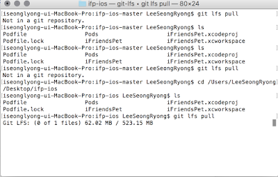 그다음 터미널을 열고, 해당 프로젝트로 가서 git lfs pull 명령어를 눌러주시면, 다운로드 받는걸 보실수 있습니다.