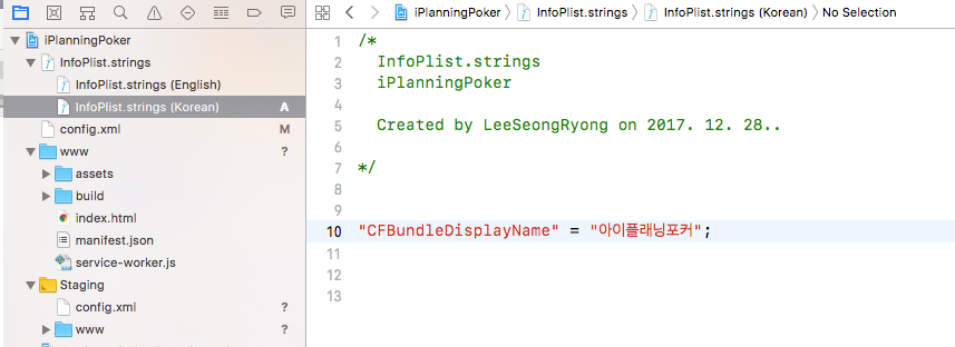 InfoPlist.strings 파일을 만들고 나서, 로컬라이징 내용을 적어주면 됩니다.