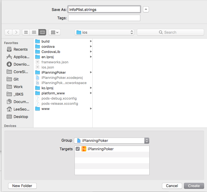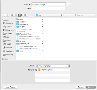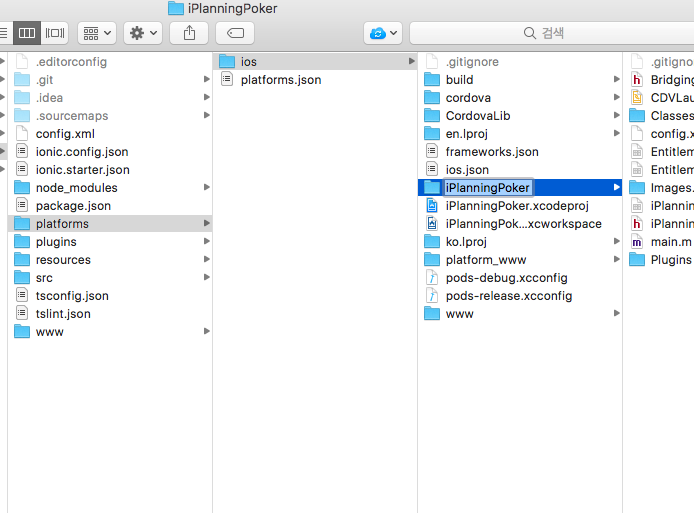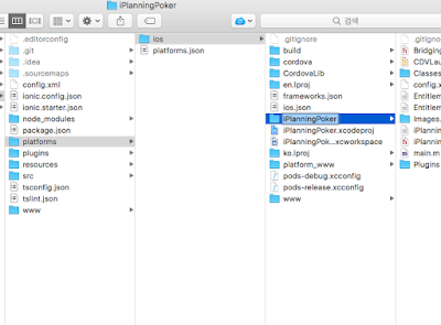 아래의 명령어로, ios 프로젝트가 생성이 되며, 작업폴더 하위에 platforms > ios 폴더가 자동으로 생성이 되고, iPlanningPoker.xcworkspace 선택하여 프로젝트를 실행할 수 있습니다