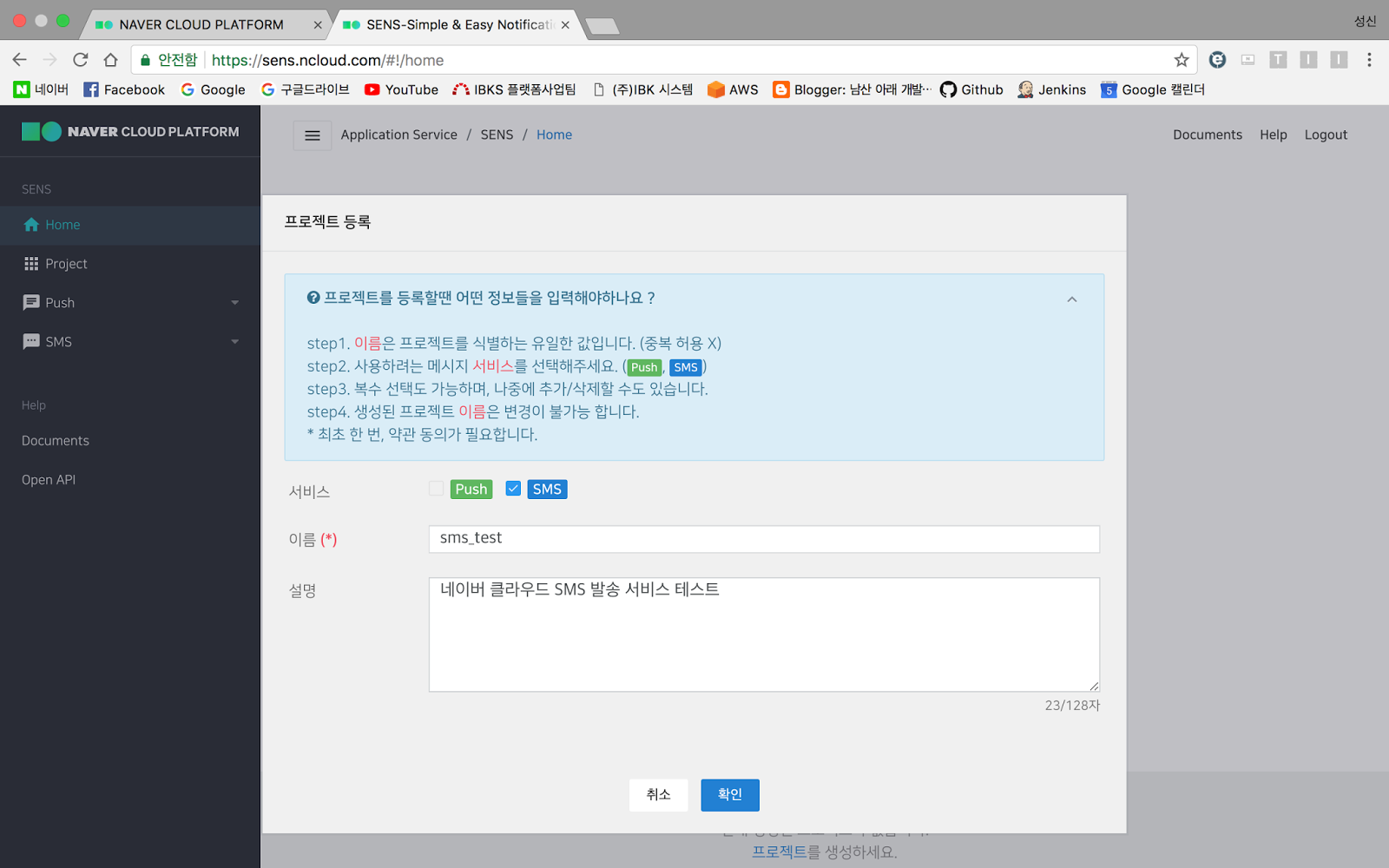 SENS는 OPEN API로도 제공되고 있어 서비스를 구현하는데 편리하게 이용할 수 있을 것 같아 한번 사용해보았습니다.