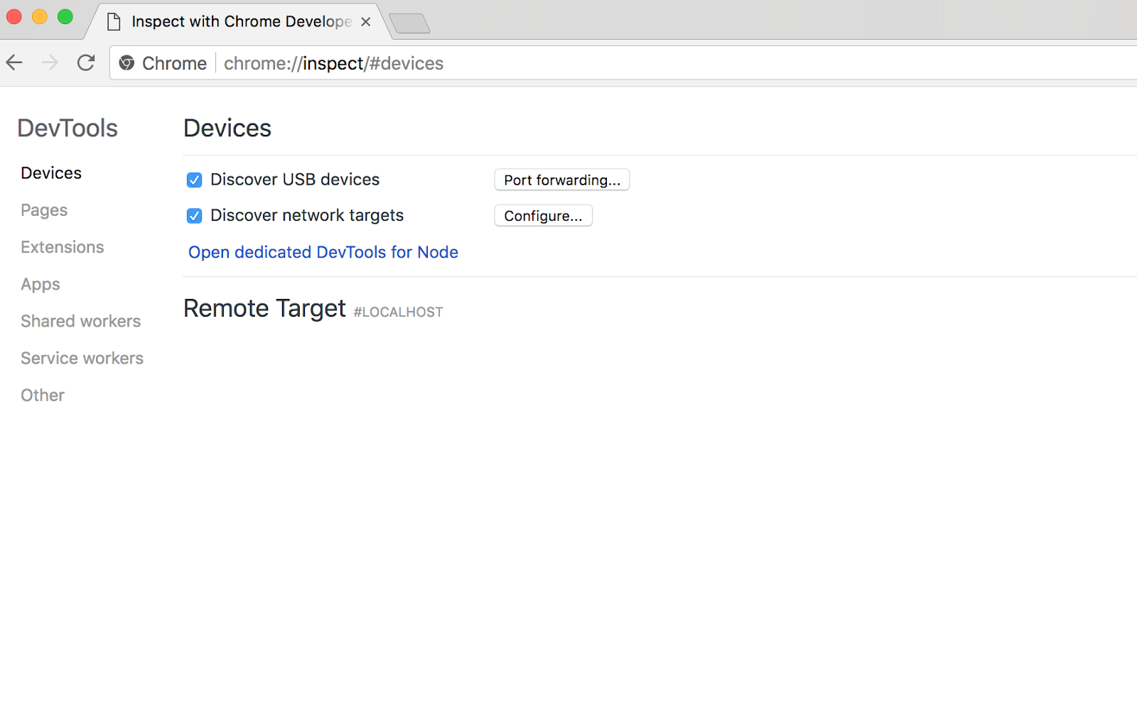 그렇다고 Logcat에서 디버깅 할 수 있는 것이 아니고, 따로 디버깅 하는 툴이 있습니다. 바로 크롬의 Inspect라는 페이지인데, 크롬에서 제공하는 개발자 툴이라고 생각하시면 되겠습니다. 진입은 Chrome을 작동한 후에 주소창에 다음과 같이 입력해 봅니다.