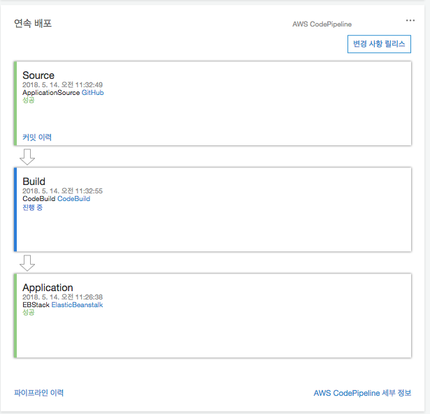 커밋을 실행함과 동시에 다시 CodeStar 콘솔에서 제가 커밋한 내역을 바로 감지하고