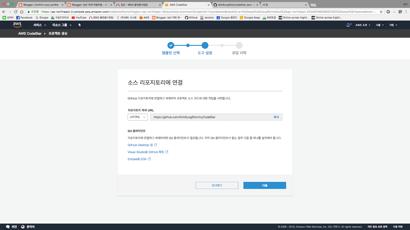 Github를 연동한 뒤, 다음으로 넘어갑니다.