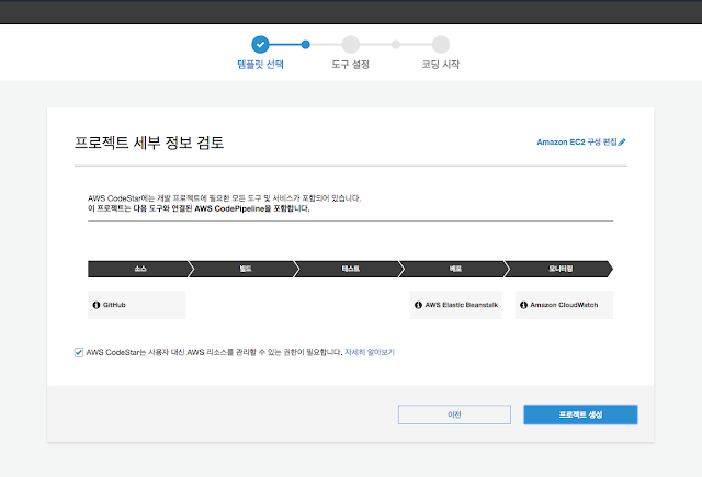 프로젝트 세부 정보를 검토하는 화면입니다. 소스 관리는 Github, 배포는 Beanstalk에서 관리형으로 제공을 하고, 모니터링은 AWS CloudWatch에서 할 수 있다고 보여지네요. 모두 확인이 되셨다면, 프로젝트 생성 버튼을 누릅니다.