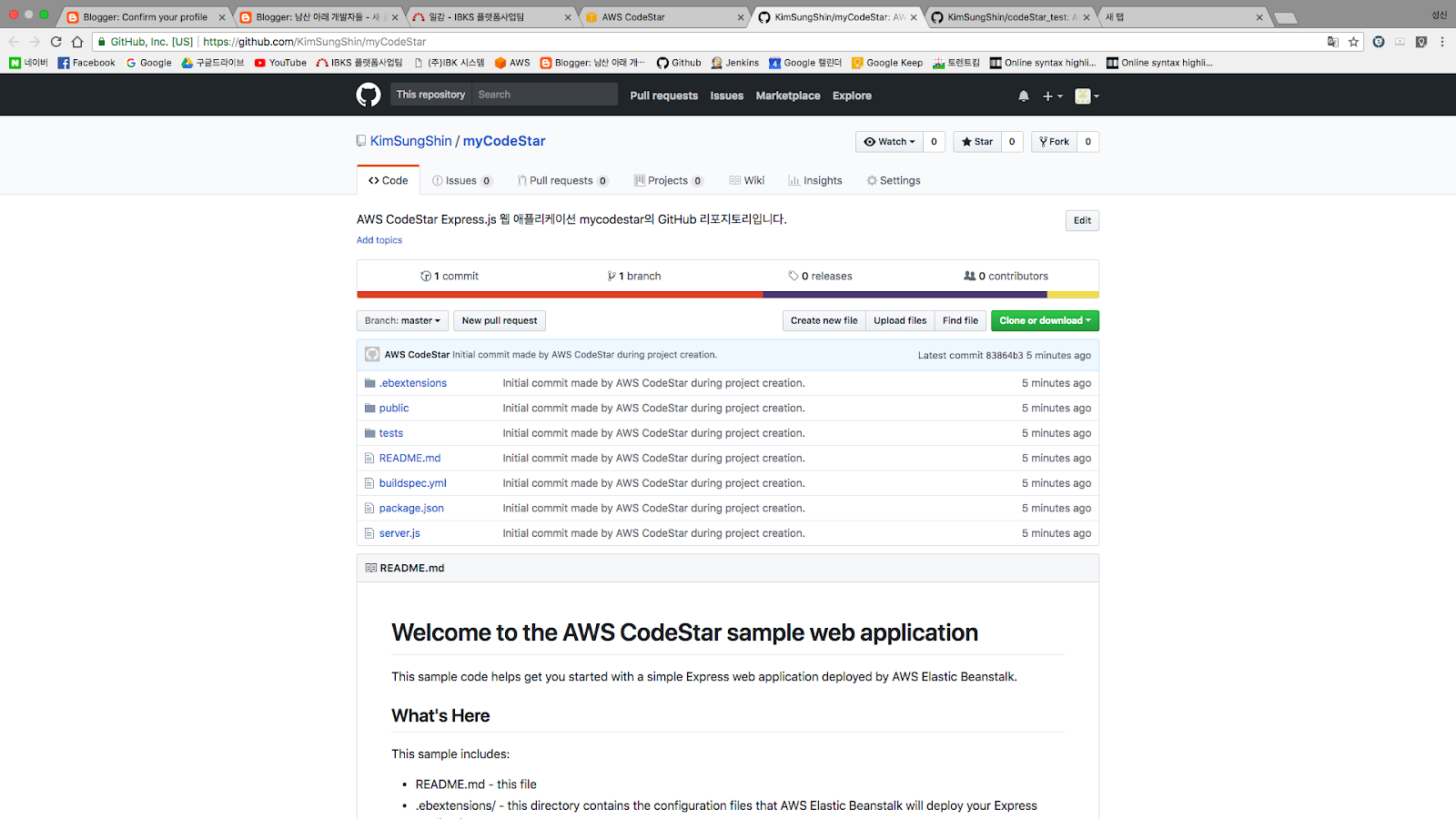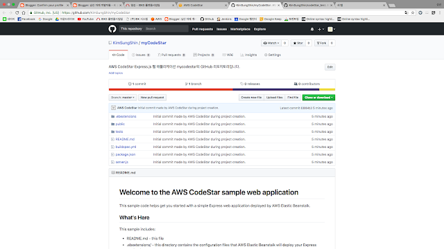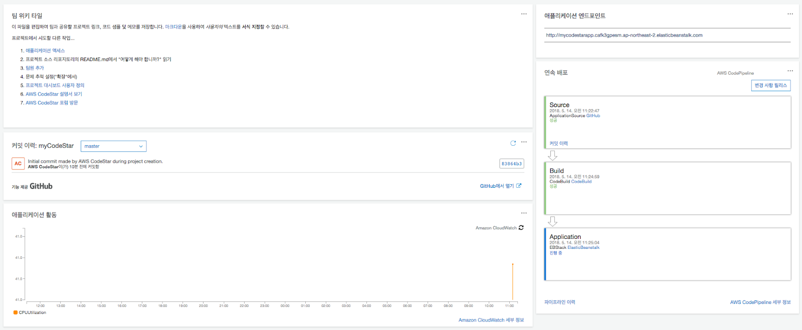 github repository를 확인하셨다면, 다시 CodeStar에 생성한 프로젝트 대시보드를 보면 최초 생성 시 대략 10분정도 후에 확인해보면 아래 그림처럼 빌드 및 배포가 된 것을 확인하실 수 있습니다.