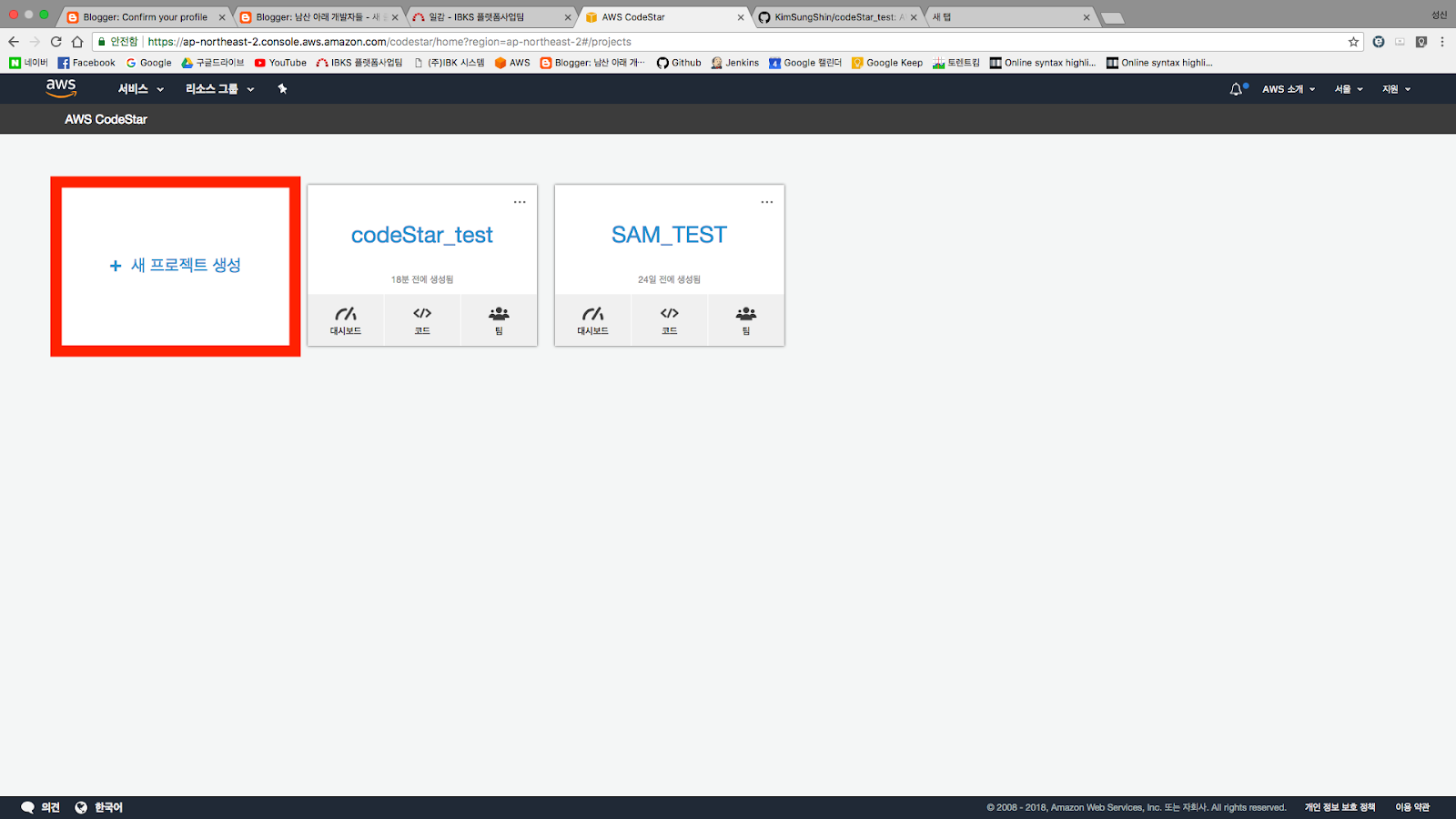 먼저 CodeStar의 콘솔화면으로 이동합니다. 새 프로젝트 생성버튼을 클릭합니다.