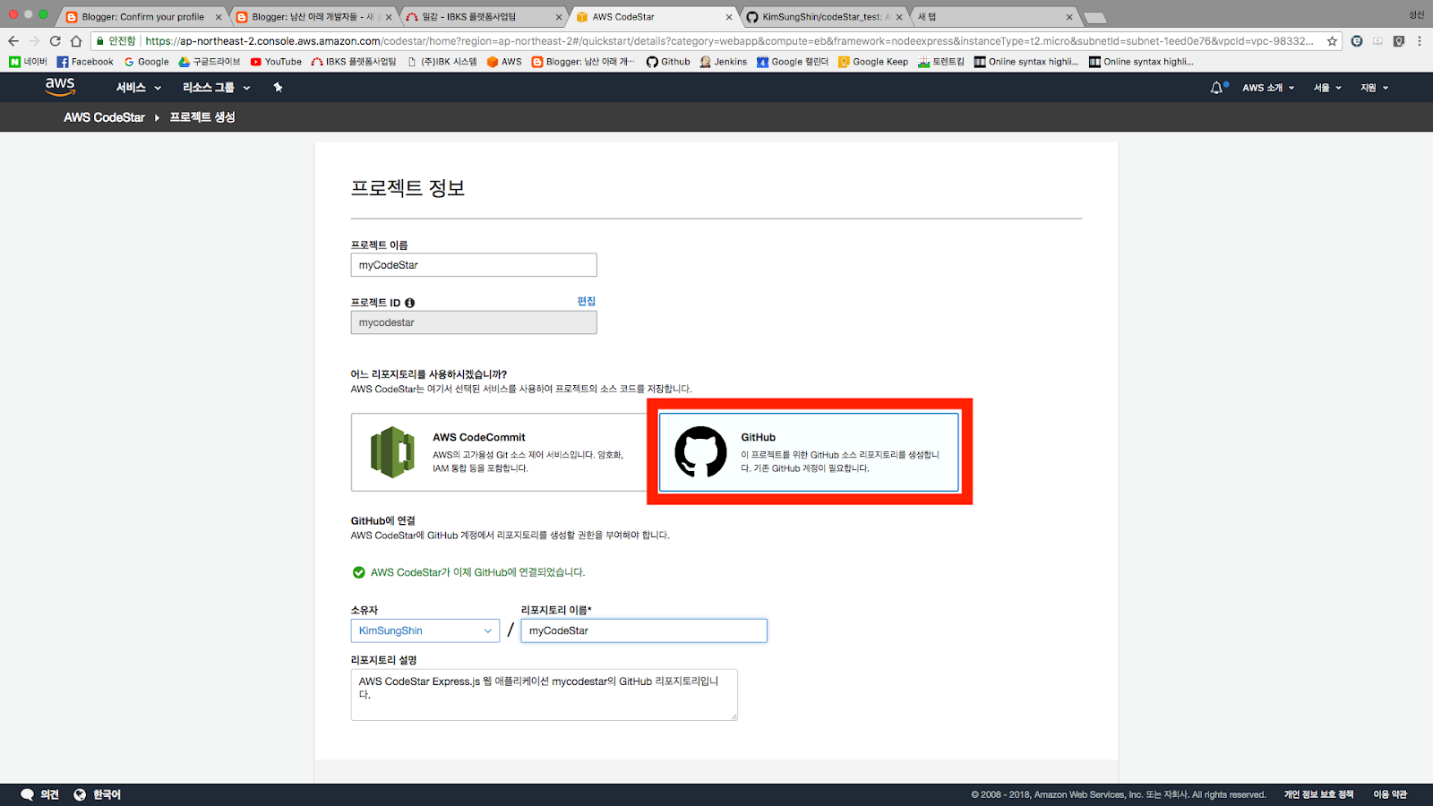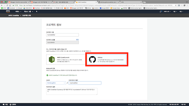 다음 화면에서, 프로젝트의 이름을 입력한 뒤, 형상관리에 대한 툴을 AWS에서 제공하는 AWS CodeCommit과 Github를 제공하고 있었는데 Github를 선택한 뒤 연결 버튼을 누르면 현재 본인이 로그인한 Github 계정과 바로 연동이 됩니다.