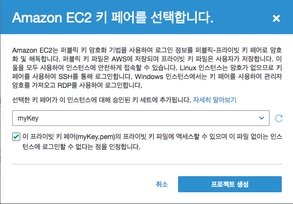 Beanstalk에서 EC2를 생성할 때 SSH 접속을 위한 키 페어를 설정하는 팝업이 뜨는데, 기존에 키 페어를 생성해두신 게 있으시다면 기존 키 페어를 선택하시고 프로젝트 생성을 누릅니다.