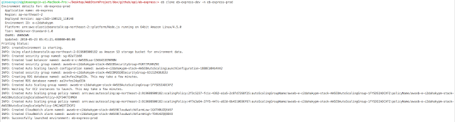 다음은, clone 명령입니다. 말 그대로, 현재 생성되어있는 환경을 새로운 환경으로 복사하는 개념과 같습니다. 사용법은 eb clone [현재 생성되어있는 환경명] [새로 만들어진 환경명] 입니다.