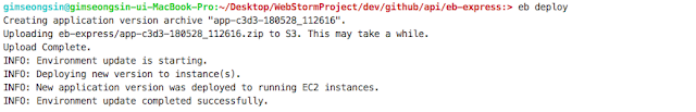 deploy는 로컬 환경에 작업하고 있는 프로젝트를 .elasticbeanstalk/config.yml 에 설정한 정보에 맞는 형태로 배포하는 명렁어 입니다. 사용버은 eb deploy 이고 가장 일반적으로 많이 사용되고 있는 명령어 입니다.