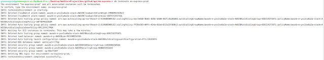 eb terminate [환경명] 으로 사용하고 제거되는 환경은 실행되고 인스턴스가 가지고있는 security group이라던지 elb들도 함께 삭제됩니다.