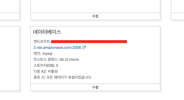 데이터베이스를 생성하고 연동하기 위하여 데이터베이스 영역 밑 '수정'을 클릭합니다.