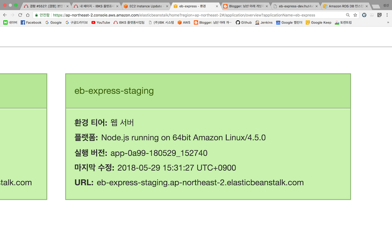 eb create 명령어를 이용하여 "eb-express-staging"이라는 환경을 새로 생성하였습니다.