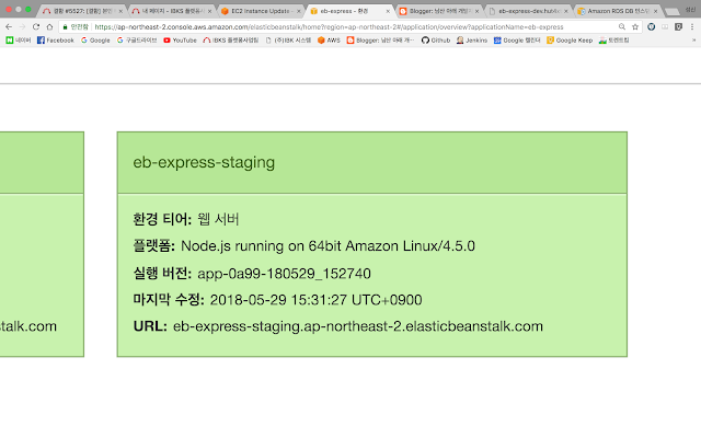 예제로 생성한 eb-express-staging 환경은 nodejs express 기반의 프로젝트입니다.