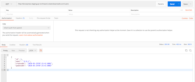 Postman을 이용하여, "eb-express-staging" 환경의 접속 URL + /users API를 호출해보면,