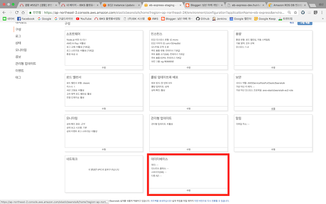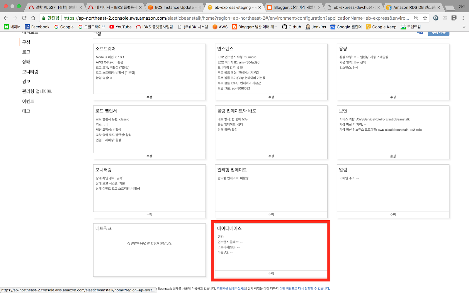 새로 생성한 환경을 선택하고 왼쪽 탭에 구성으로 가보면, "eb-express-staging" 환경의 구성정보를 확인하실 수 있습니다.