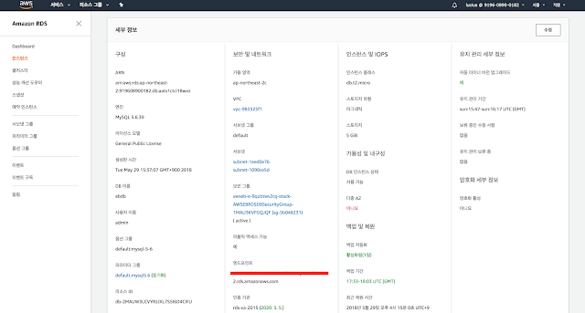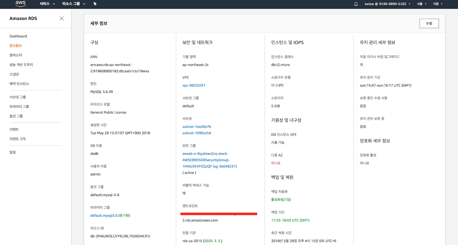 이렇게 생성 된 DB는 실제 RDS 콘솔에서도 확인하실 수 있습니다. Elastic Beanstalk 콘솔에서 기본적으로 생성한 정보들 이외에도 상세 설정 정보들은 RDS 콘솔에서 변경이 가능합니다.