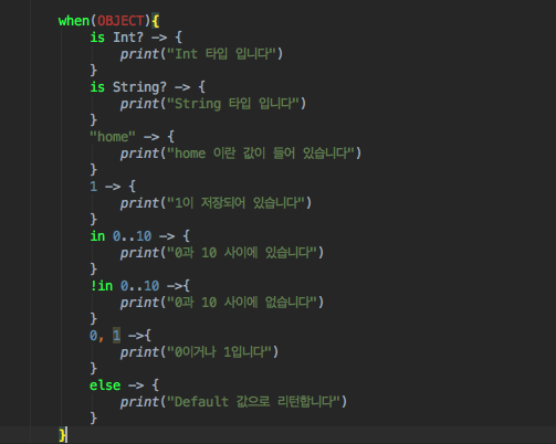 일반적인 Switch문은 하나의 타입 내에서만 case를 통해 값을 구분할 수 있지만, Kotlin에서의 When문은 하나의 타입이 아닌 광범위한 case를 사용할 수 있습니다.