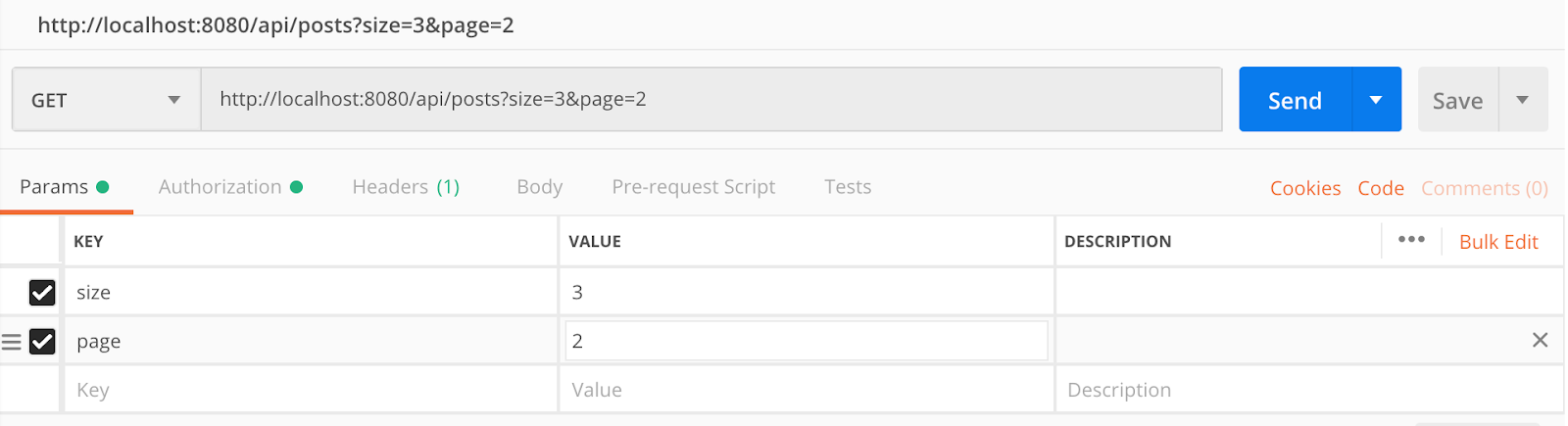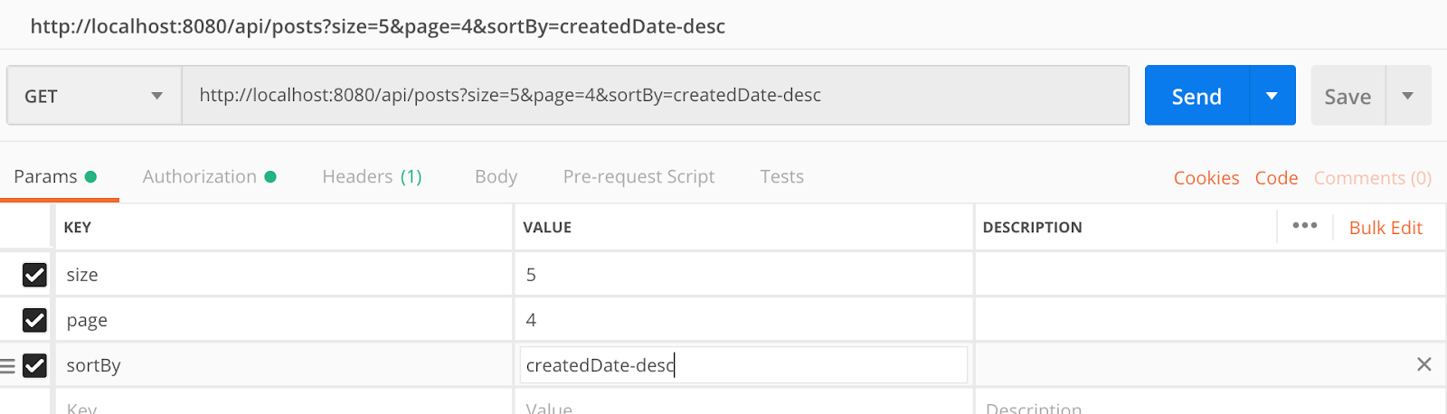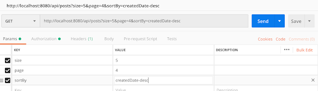 - sort : Sorting에 대한 값 설정하는 파라미터로, 기본적으로 오름차순이다. 표기는 정렬한 필드명,정렬기준 ex) createdDate,desc