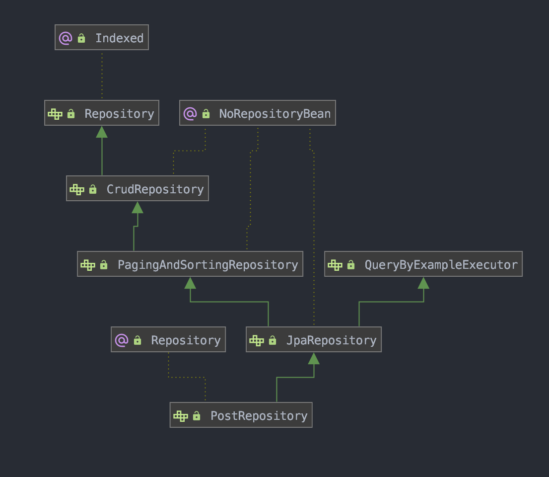 위 다이어그램에서와 같이 생성한 PostRepository는 JpaRepository를 상속받았고, 또 JpaRepository는 PagingAndSortingRepository를 상속받은 것을 확인할 수 있습니다.