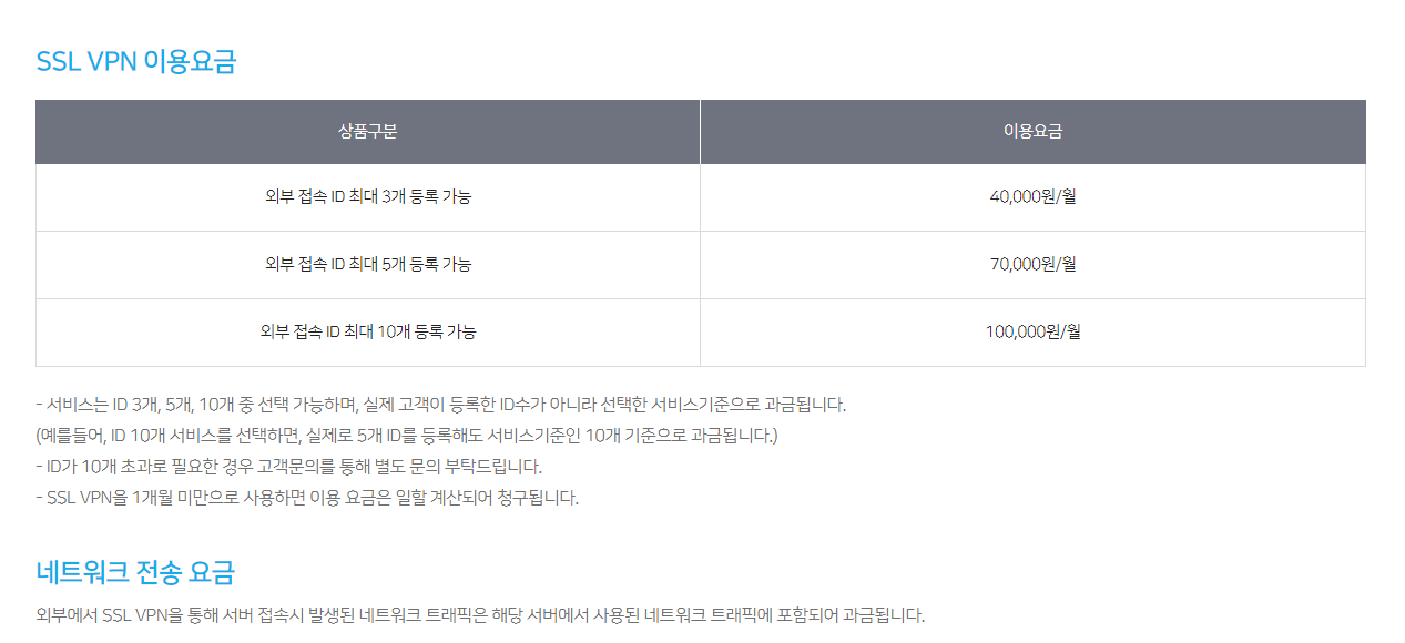 서비스 이용 요금은 외부 접속 가능한 ID 수량에 따라 정해지며 SSL VPN을 통한 데이터 전송 요금은 기본 네트워크 전송 요금과 동일합니다.