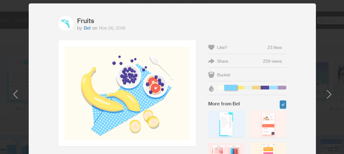 목록에서 보고 싶은 디자인 작업물을 선택한 뒤, 오른쪽에서 원하는 컬러를 선택하면 해당 컬러톤의 디자인 작업물을 찾아줍니다. 원하는 컬러 톤 벤치를 할 때 유용하구요.