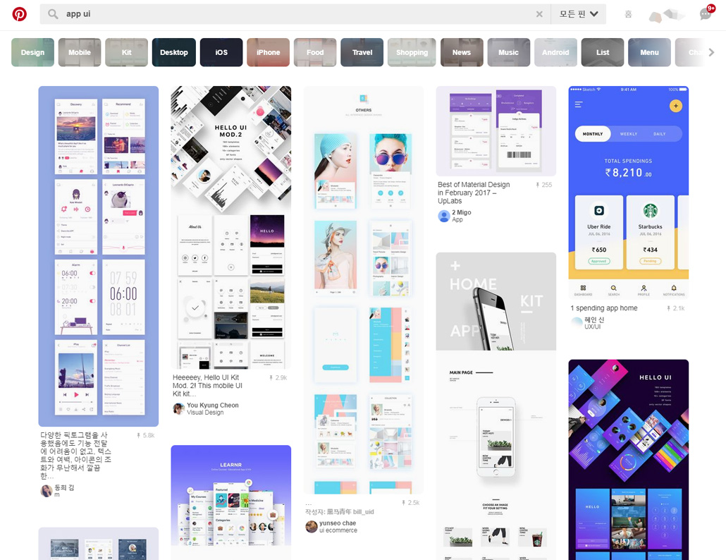 핀터레스트에서 app ui design 등으로 검색하면 정말 많은 자료를 찾아볼 수 있습니다. 웬만한 포트폴리오 모음 사이트보다 좋더라구요