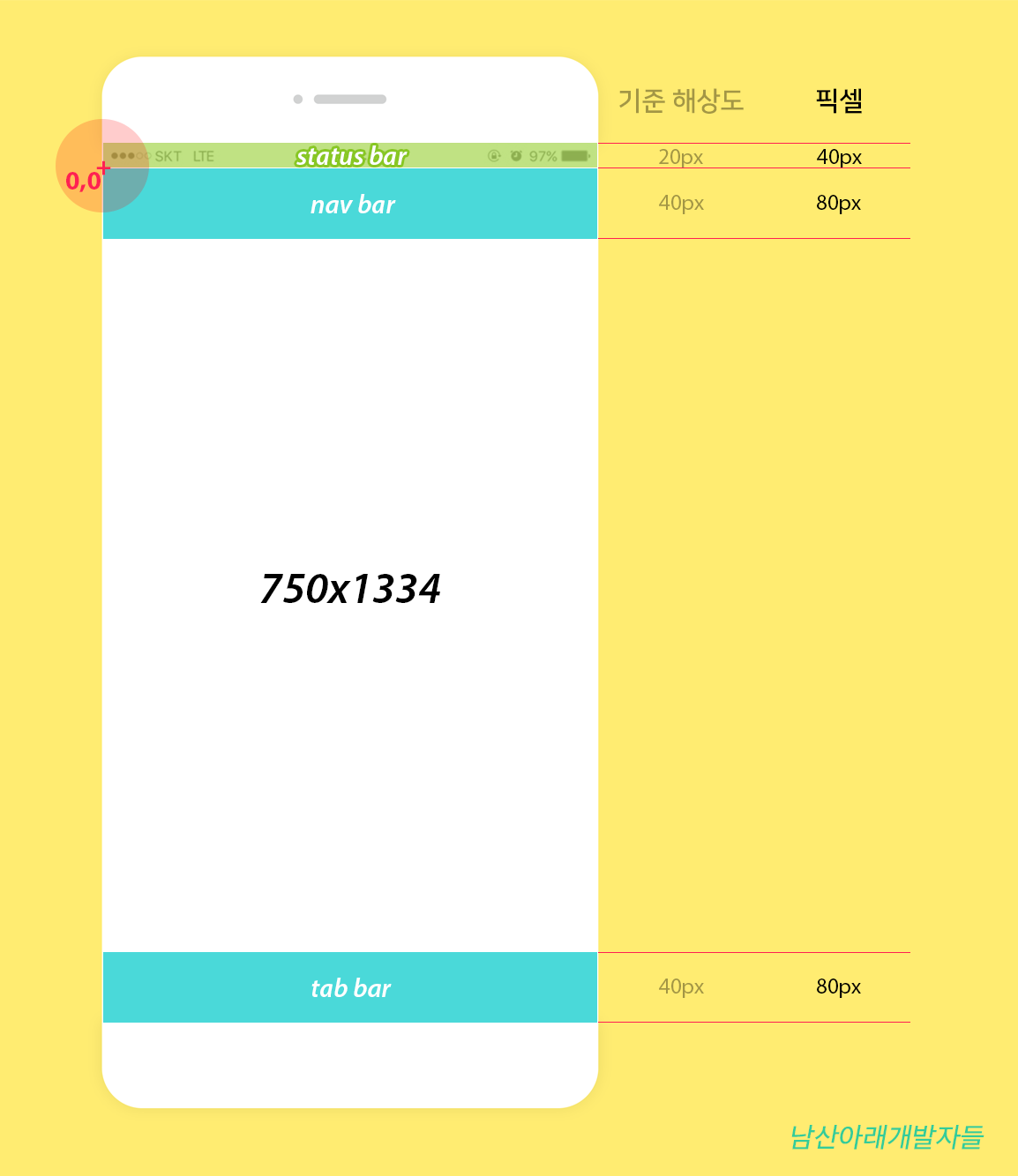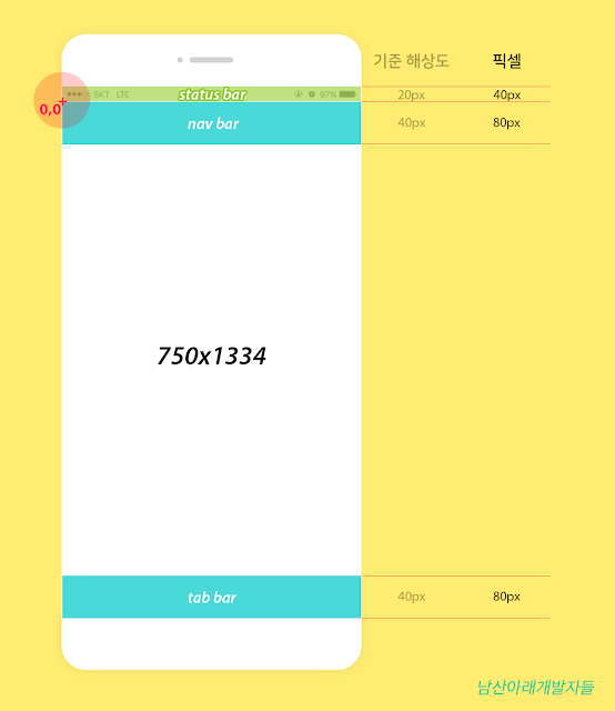 아이폰은 절대 좌표로 작업합니다. 그러니까 상단 Status Bar 밑에 0,0 찍어놓은 저 곳을 기준으로 절대 좌표를 계산해서 가이드를 만들면 개발자가 그곳을 기준으로 위치를 계산해 넣습니다. 이것도 개발자마다 다를 수 있으니 작업 전에 좌표 기준을 어디로 할지 한번 확인해 보시는 게 좋을 것 같구요.