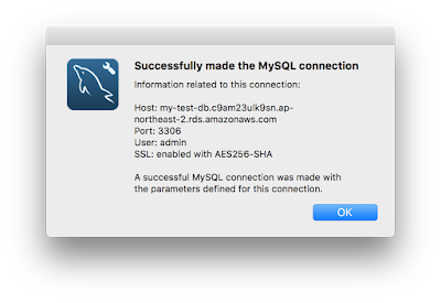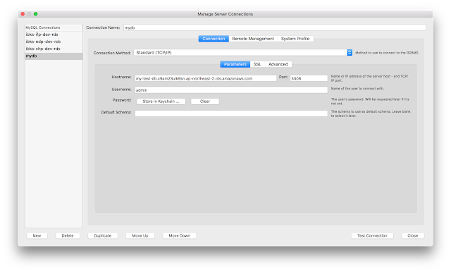 호스트네임의 전에 복사했던 엔드포인트를 입력하시고 포트는 기본 mysql 포트인 3306username은 위에서 입력했던 계정정보를 입력합니다. 입력하고 Test Connection을 해보면