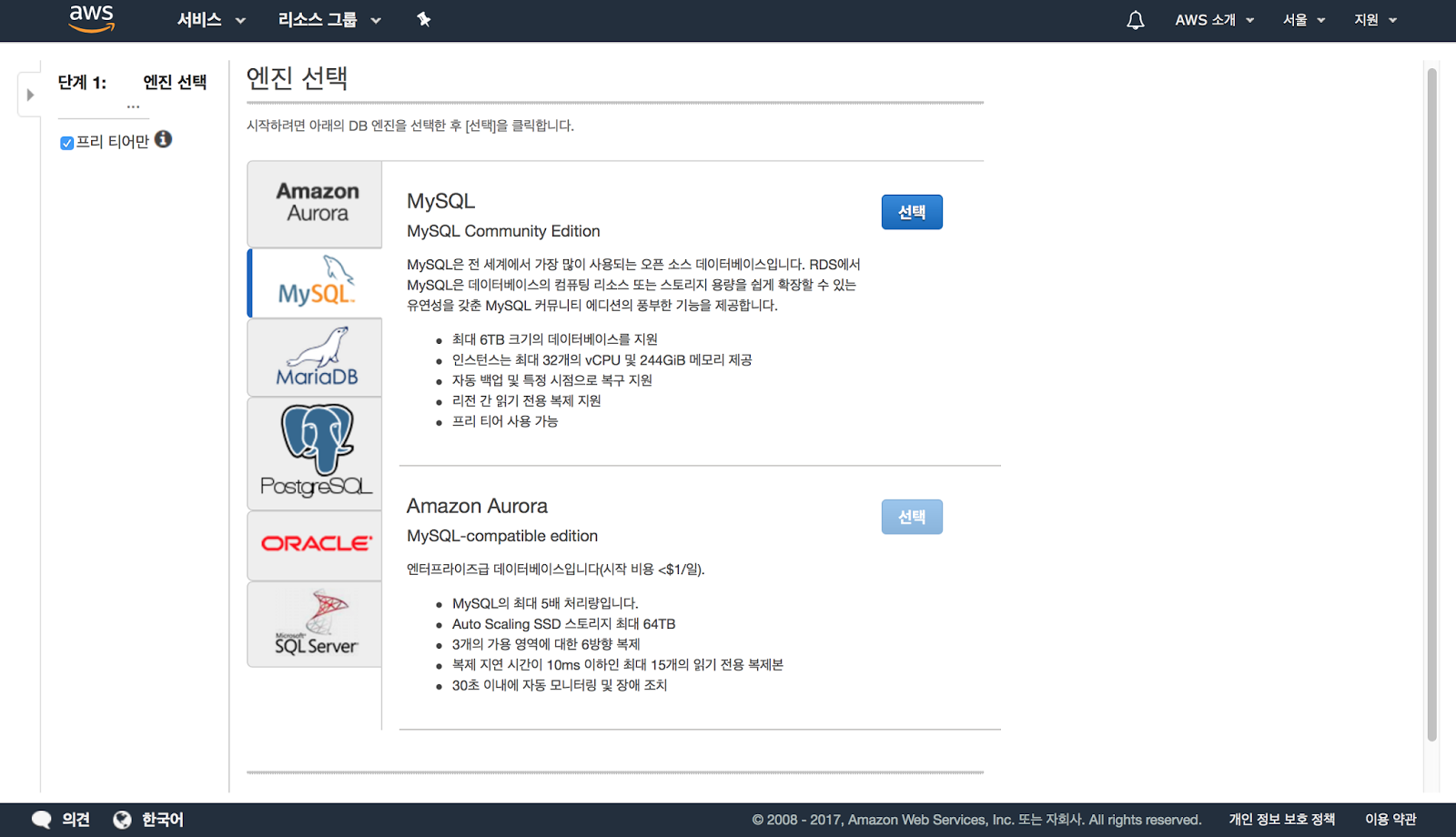 DB엔진을 선택하는 화면인데 저희는 MySQL을 선택합니다.