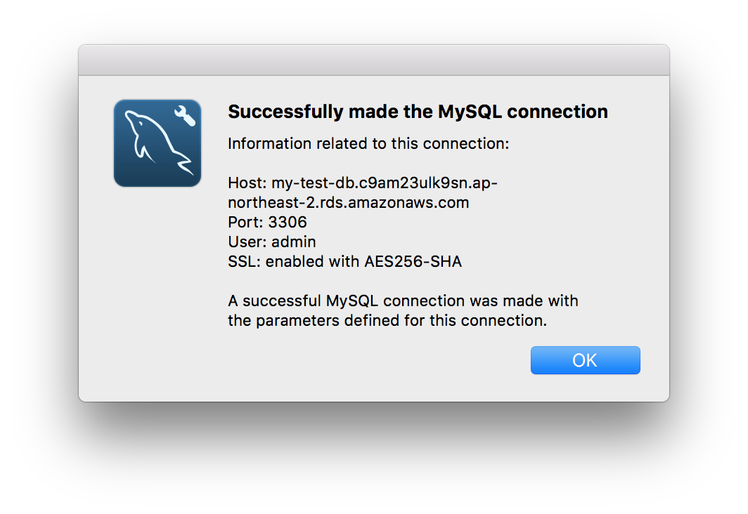 성공적으로 connection을 생성했다는 메시지를 확인할 수 있습니다. 이제 실제 DB에 접속해보면