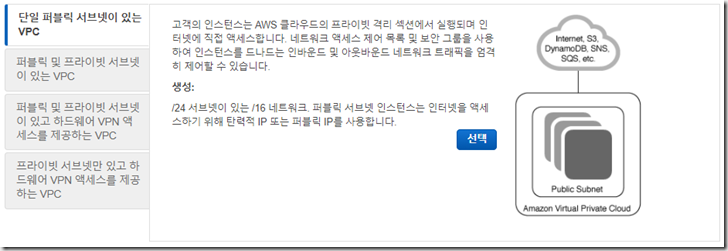 다음은 VPC 마법사를 통해서 생성이 가능한 4가지 구성입니다.