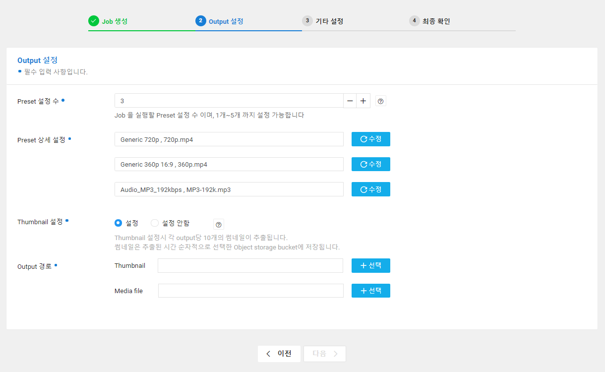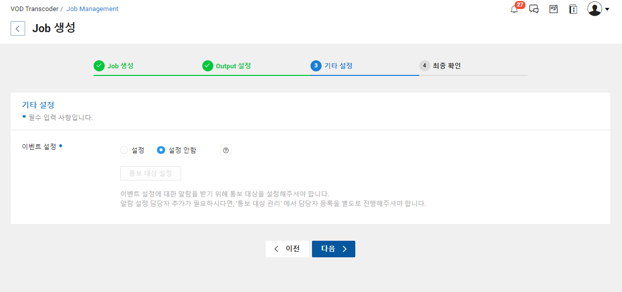 다음으로 Transcoding 프로세스 관련 이벤트 및 통보대상 설정 진행이 가능합니다.