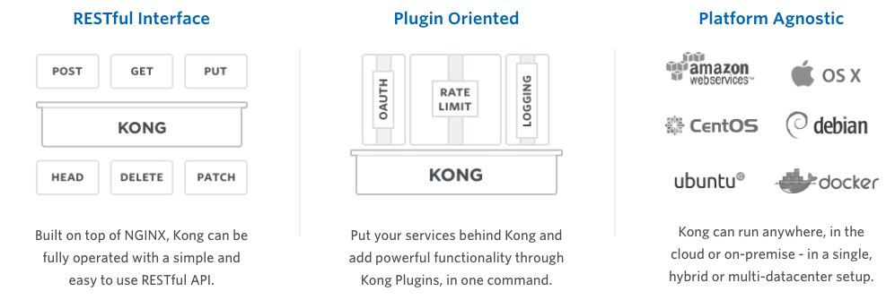 이외에도 가장 큰 특징은, 모든 기능을 Restful Interface로 제공하고 있으며, API Gateway를 구성하는 필수 기능들, 예를 들면 OAuth 인증, Logging, 유량제어 등을 Plugin 기반으로 손쉽게 추가하여 사용할 수 있으며, 위에서 언급한대로 Platform(런타임)에 구애받지 않고 어디서든지 Kong을 구축할 수 있습니다.