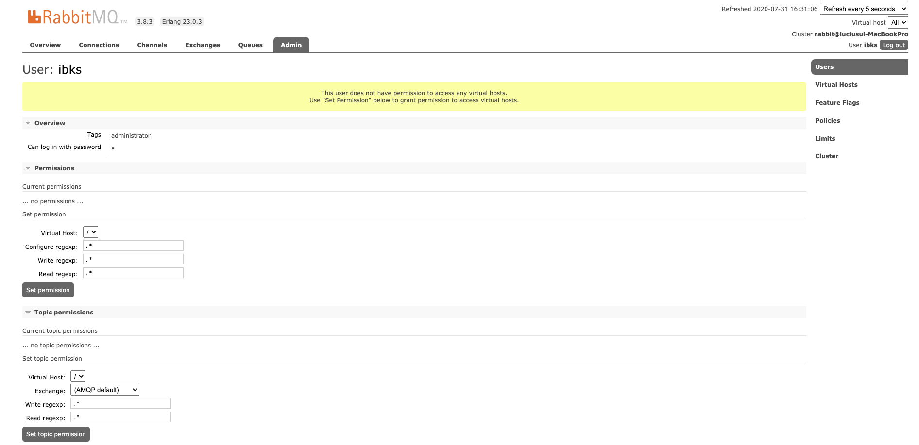$ rabbitmqctl set_user_tags ibks administrator