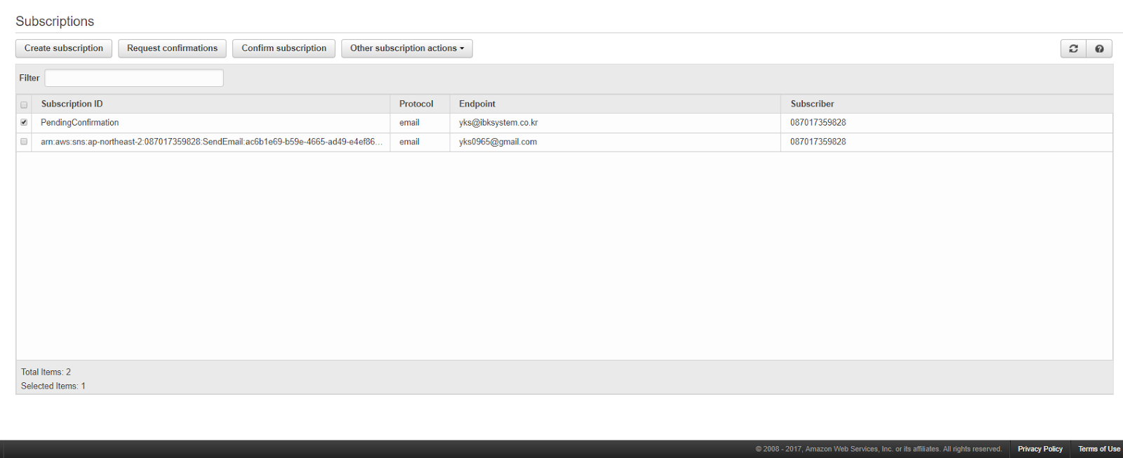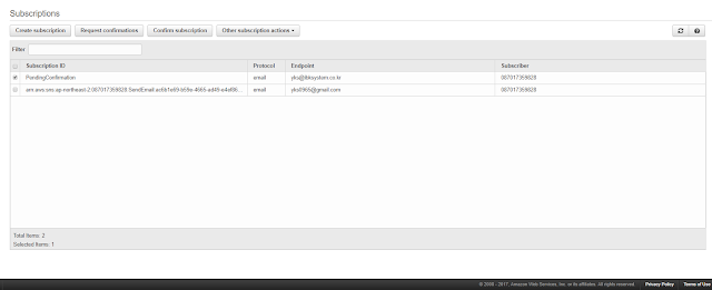 다시 AWS 콘솔화면으로 돌아오면 해당 계정에 SubscriptionID 가 정상적으로 생성된 것을 확인할 수 있습니다.