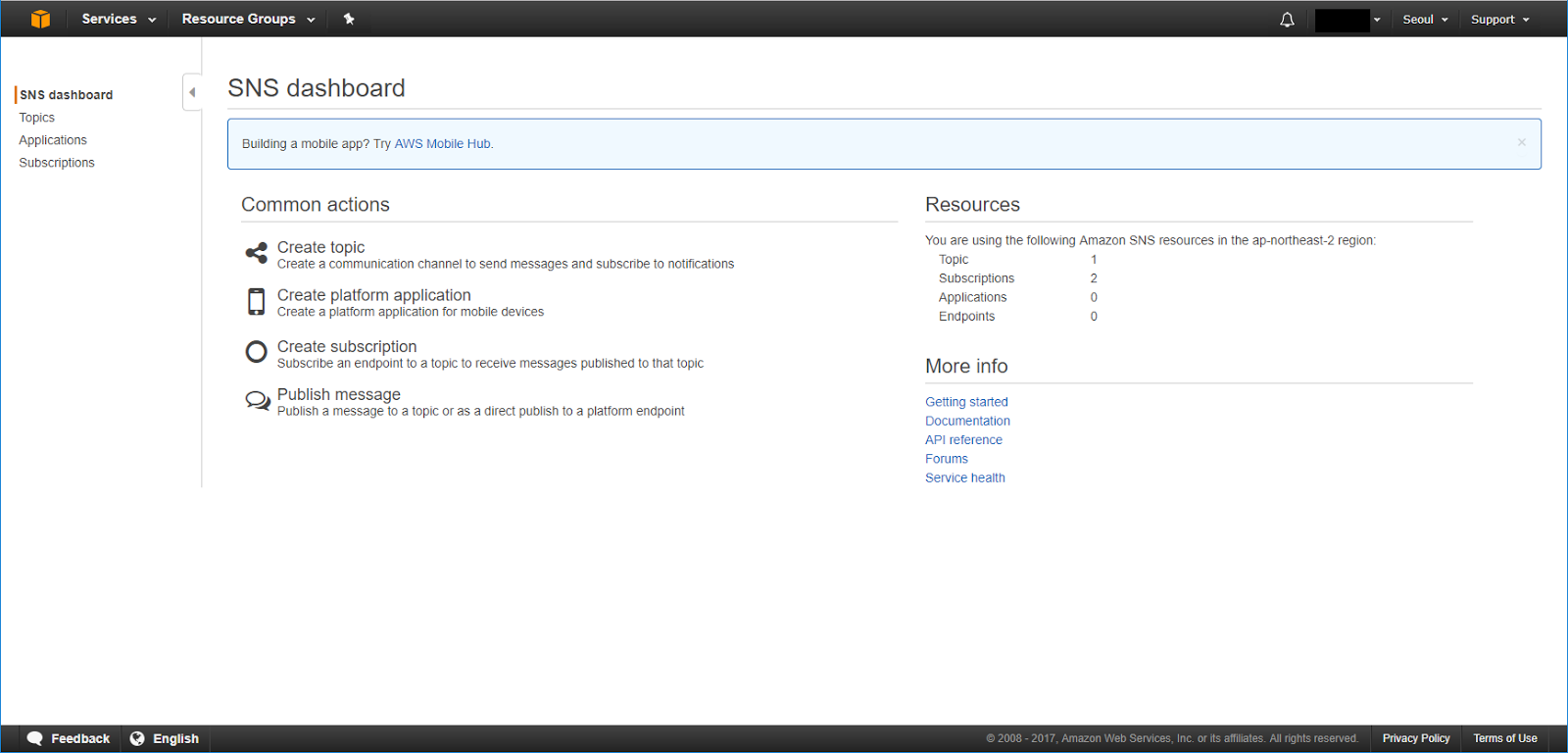 우선 AWS Console에 접속하여 SNS 메뉴로 이동합니다.