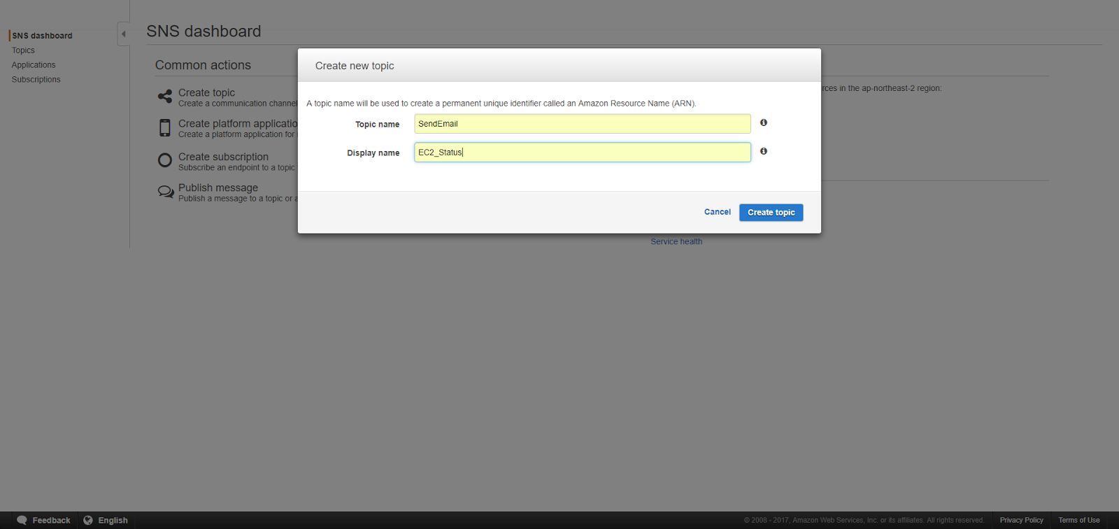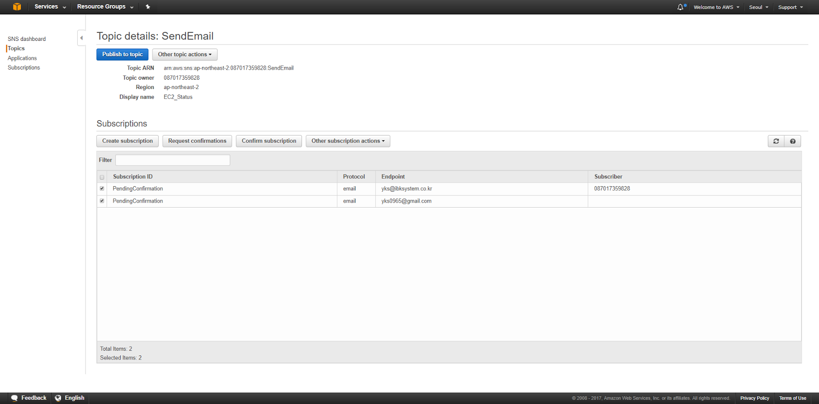TopicARN은 자동으로 입력되어 있습니다