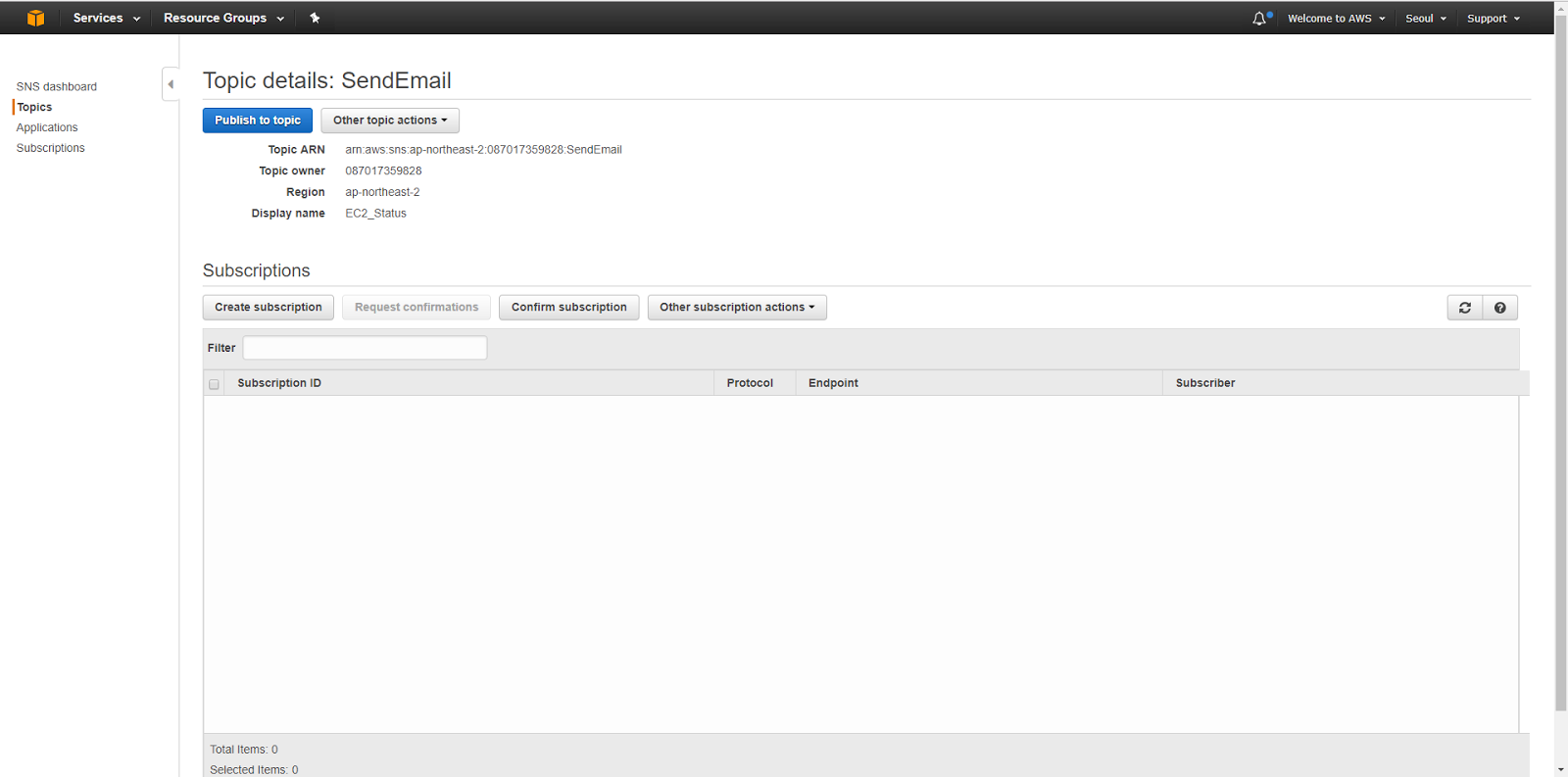 주제 항목에 위에서 생성한 SendEmail Topic 을 선택합니다.