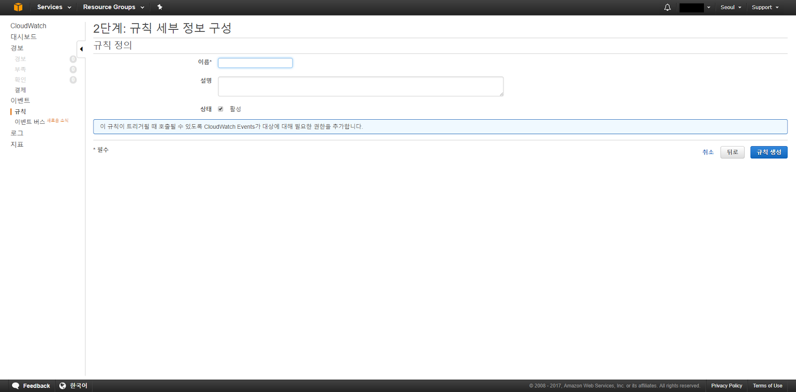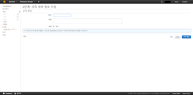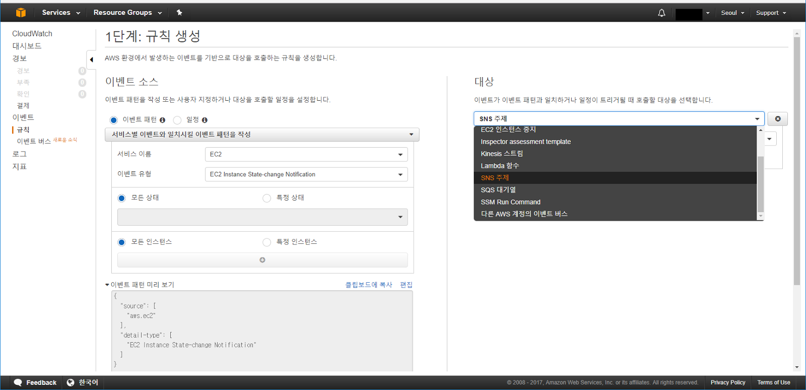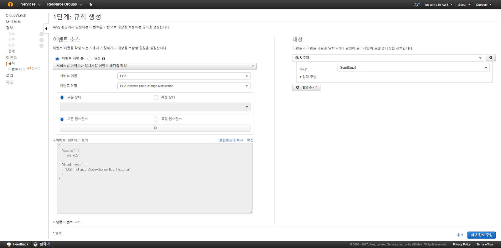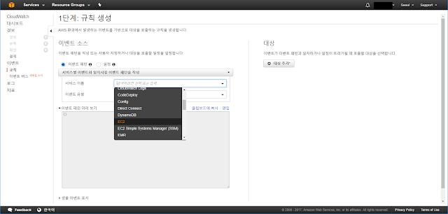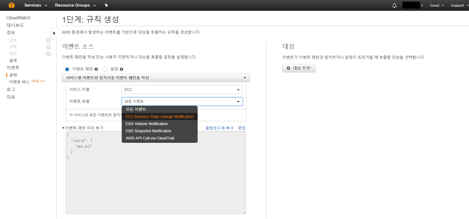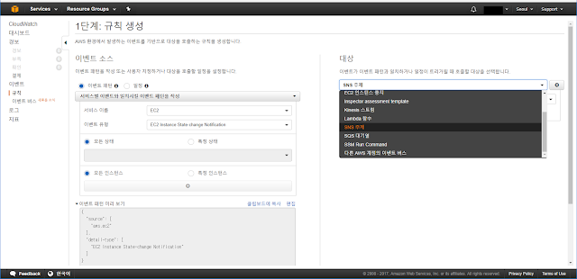 이제 EC2 인스턴스의 상태가 변경되는 시점에 이벤트가 발생하도록 CloudWatch 이벤트 규칙 설정을 진행해 보도록 하겠습니다.