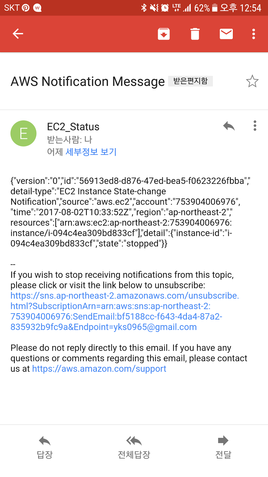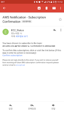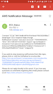 이제 인스턴스가 신규로 생성되거나 Stop, Terminate 등 상태가 변경될때 마다 설정한 이메일로 위와 같이 알림이 전송되는 것을 확인 할 수 있습니다.