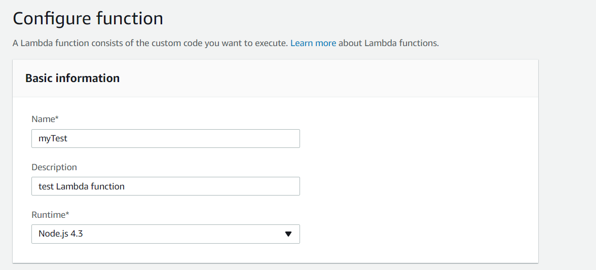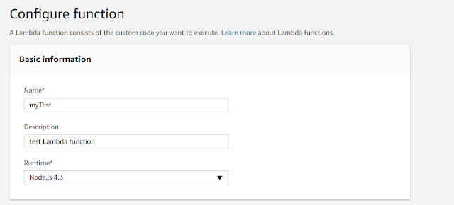 5. Step 3. 로 함수를 정의하는 부분입니다. 메인이 될 수 있는 부분인데요. 일단 저는 기본 정보에 myTest라는 함수명을 등록하고 Runtime은 Nodejs 4.3으로 설정했습니다.