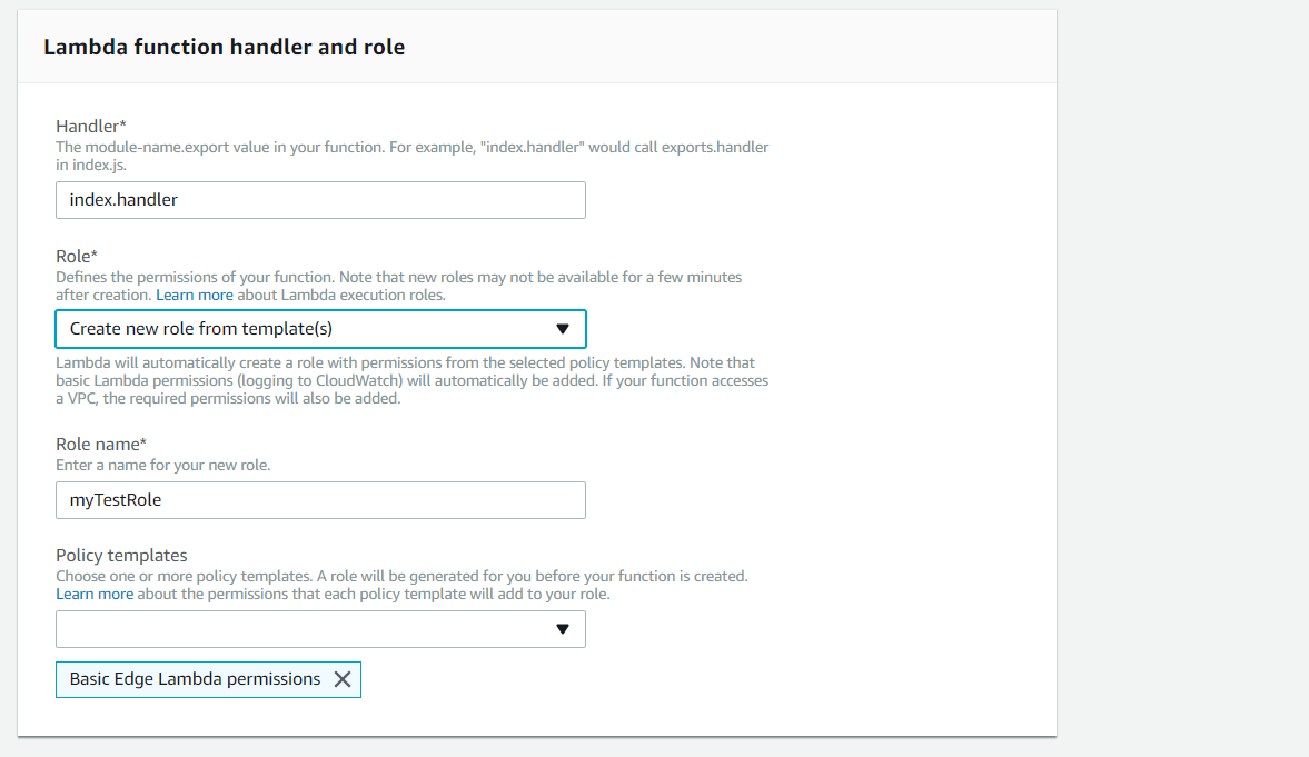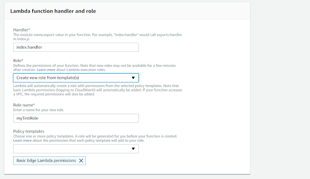 7. 위에서 소스코드를 작성하였고 하단에 Role설정 부분이 있습니다. 지금 저희가 등록한 Role이 없기 때문에 new role을 체크하고 name 작성하시고 저희는 기본 Lambda함수만 실행하므로 Policy templates에서 Basic Edge Lambda permissions를 클릭합니다.