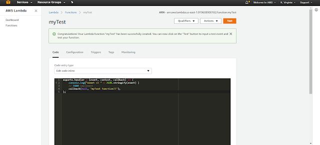 9. 이제 myTest란 Lambda function이 생성 된 것을 확인 하실 수 있습니다.