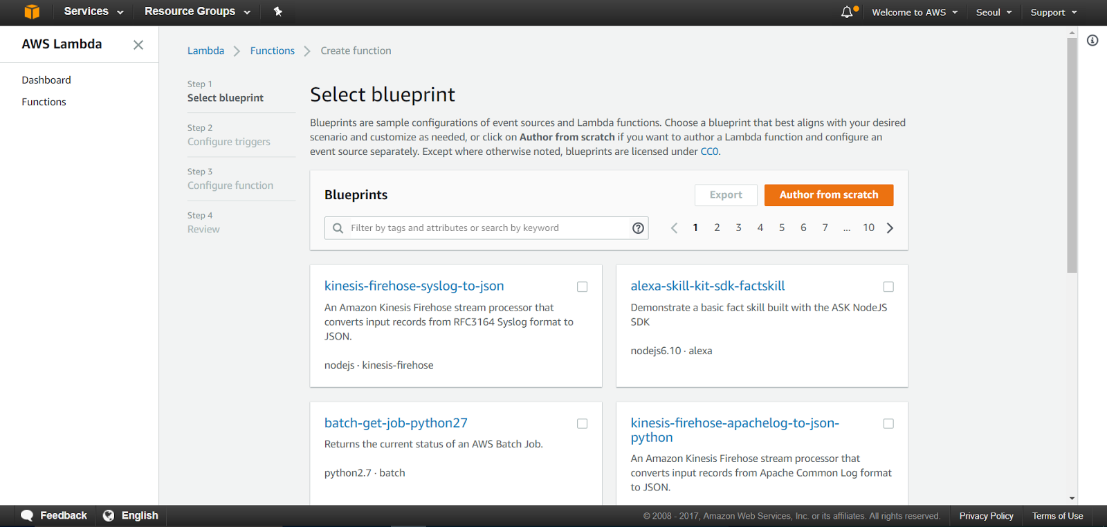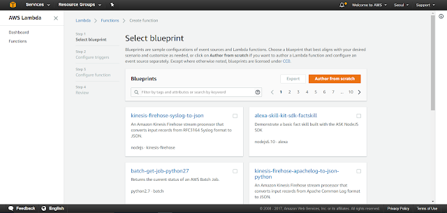 3. Step1.으로 blueprints를 설정하는 화면이 나오는데요. Lambda에서는 BluePrints 검색을 통해 사용자가 원하는 서비스들을 기능별로 템플릿형태 처럼 제공하고있습니다.