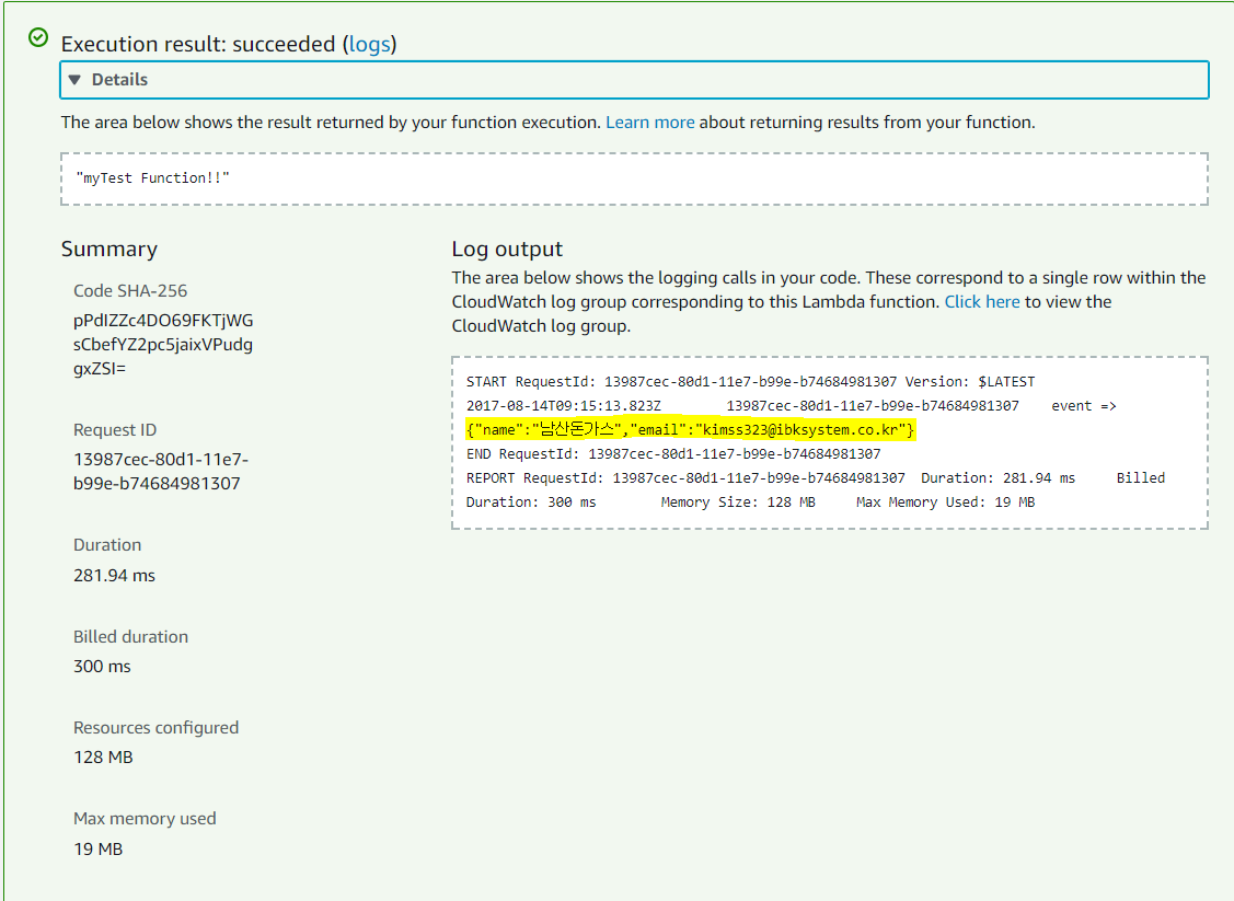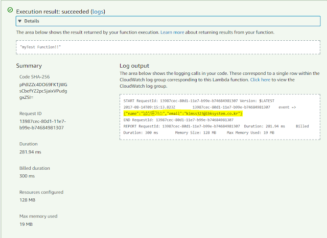 Log output에는 코드에 event값을 출력해주는 log를 설정해두어 test event팝업에서 입력한 event 값들이 출력 된 것을 확인할 수 있습니다.