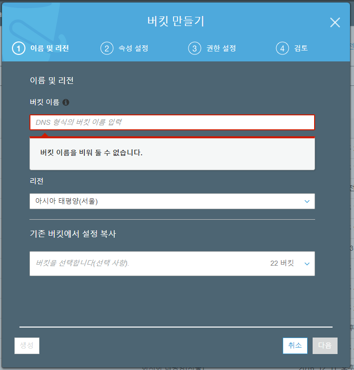 버킷이름 과 버킷 리전을 입력하고 “생성” 을 선택합니다.