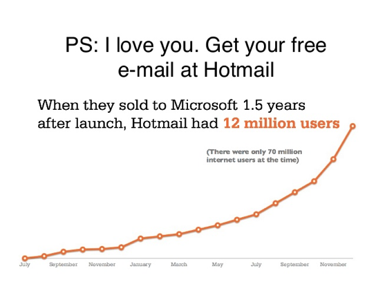 이 문구를 이메일 하단에 넣은 후 하루 3,000명 정도의 사용자가 있던 핫메일은 6개월 만에 백만 명의 이용자가 생기고, 5주 뒤 이용자 수는 다시 두 배가 되었습니다. 1997년 12월, 거의 1,200만 명의 이용자를 확보한 핫메일은 마이크로소프트Microsoft 가 4억 달러에 인수했습니다. (당시 인터넷 사용자는 고작 7,000만 명이었다고 합니다)