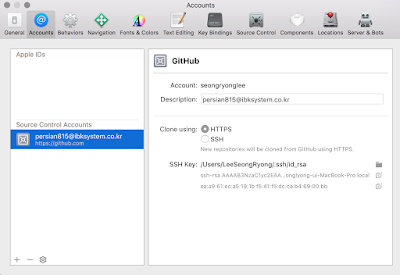- Xcode를 열고 preference > Account 를 선택하고 Git 계정을 입력합니다.