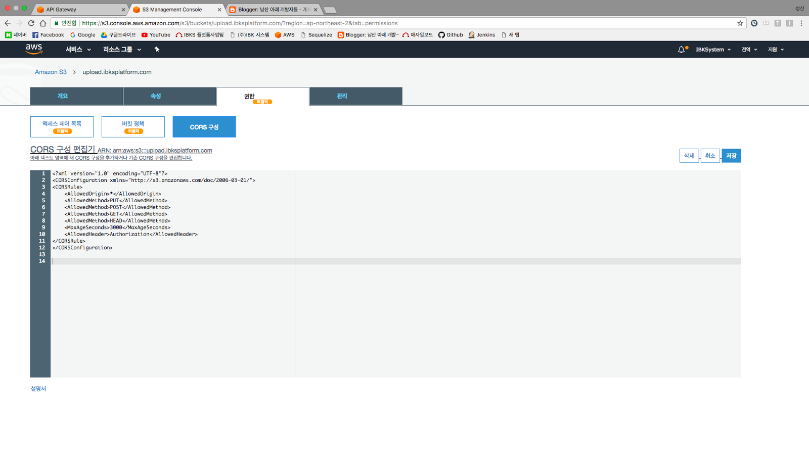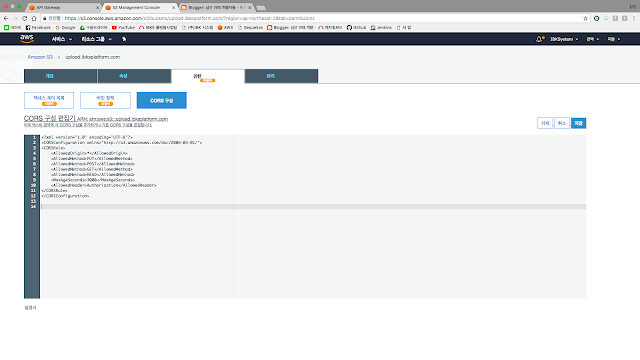 버킷정책을 설정 한 뒤 CORS 구성 탭을 선택하여 아래와 같이 입력합니다.